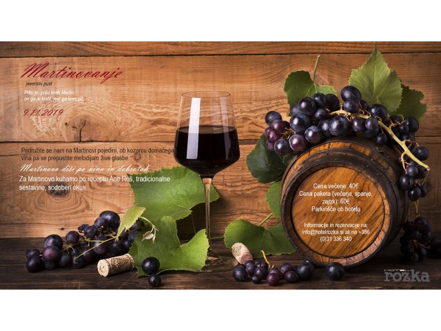 Vabimo vas na Martinovanje v Hotelu Rozka na Krvavcu, v soboto, 9. novembra 2019 ob 19. uri. Ob kozarcu domačega mladega vina vinogradniške družine Pajnkiher in domačega terana iz Dutovelj, se boste na Martinovi pojedini družili ob melodijah slovenske žive glasbe. Kuhali bodo po receptu kuharice Ane Roš. Rezervacije in informacije: info@hotelrozka.si ali 031 336 340.